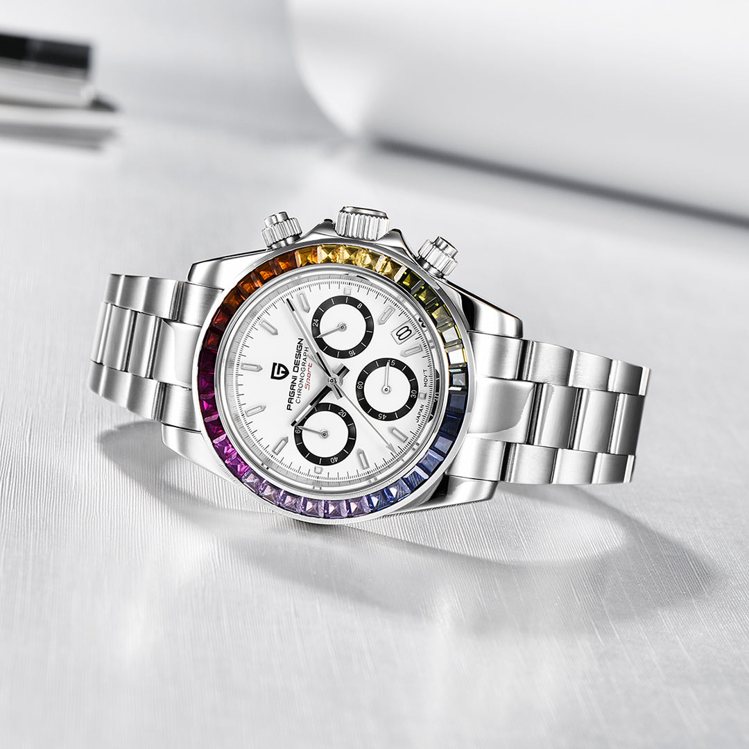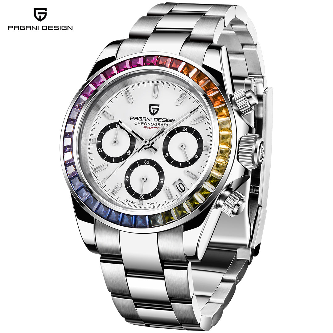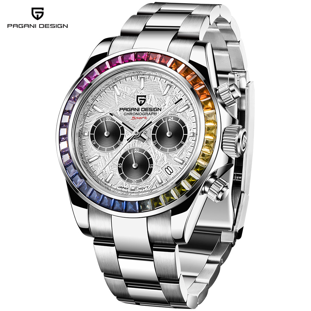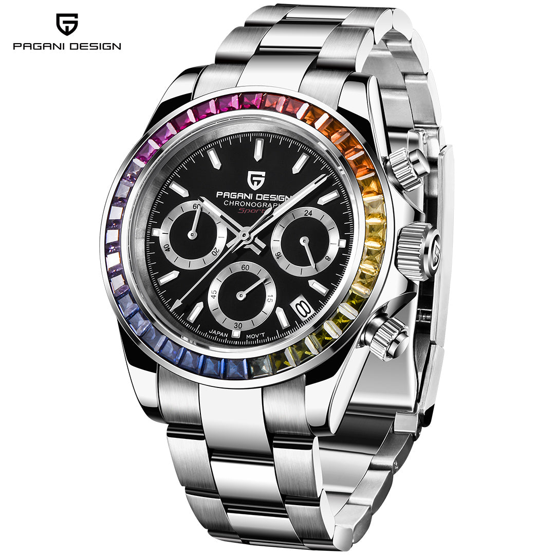 PAGANI DESIGN PD1644 Men's Chronograph Quartz Watches Rainbow Bezel Stainless Steel Sports Wristwatch SEIKO VK63 Movement, Sapphire Dial Glass