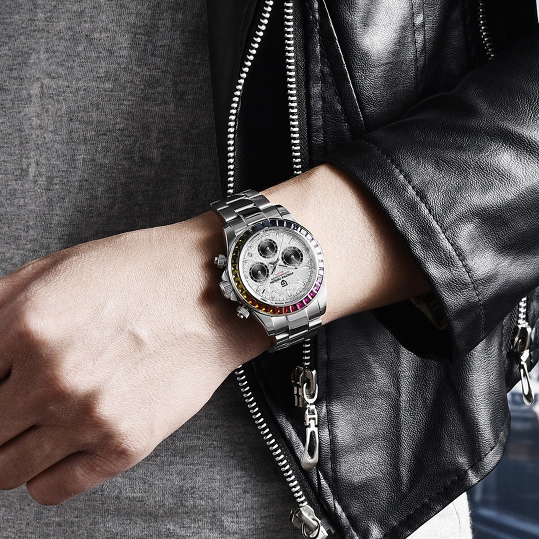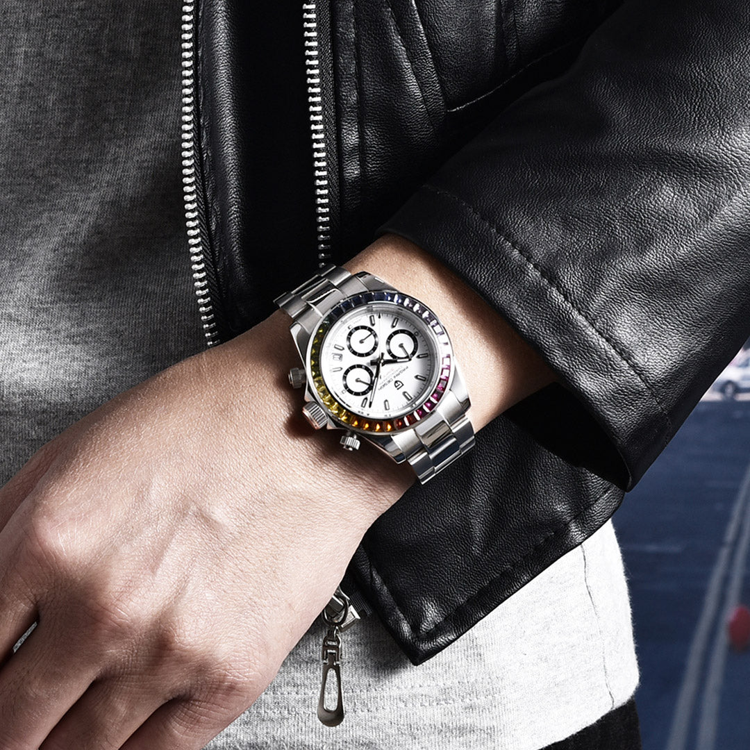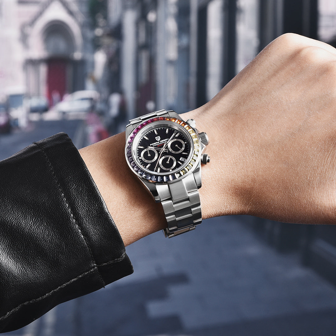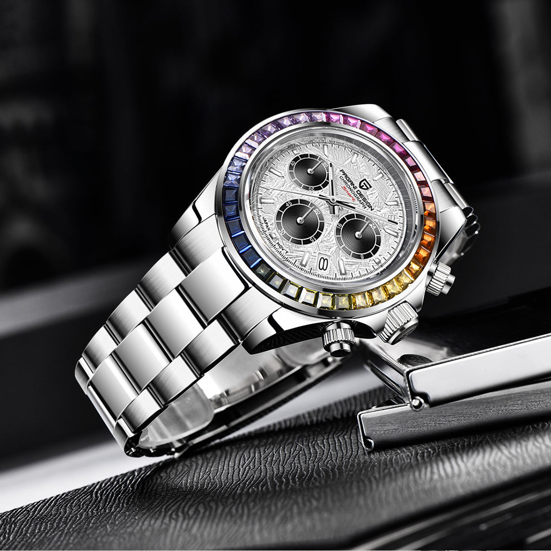 PAGANI DESIGN PD1644 Men's Chronograph Quartz Watches Rainbow Bezel Stainless Steel Sports Wristwatch SEIKO VK63 Movement, Sapphire Dial Glass