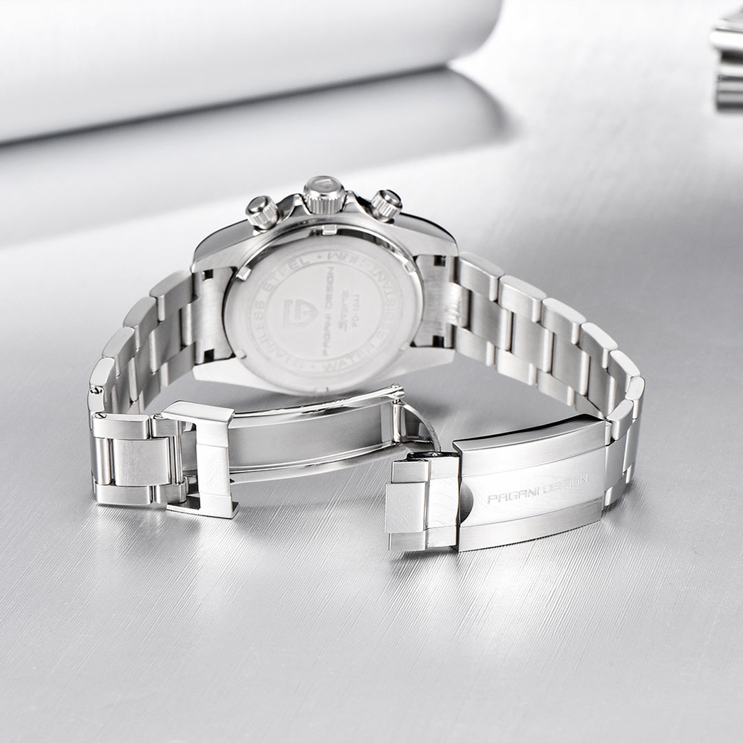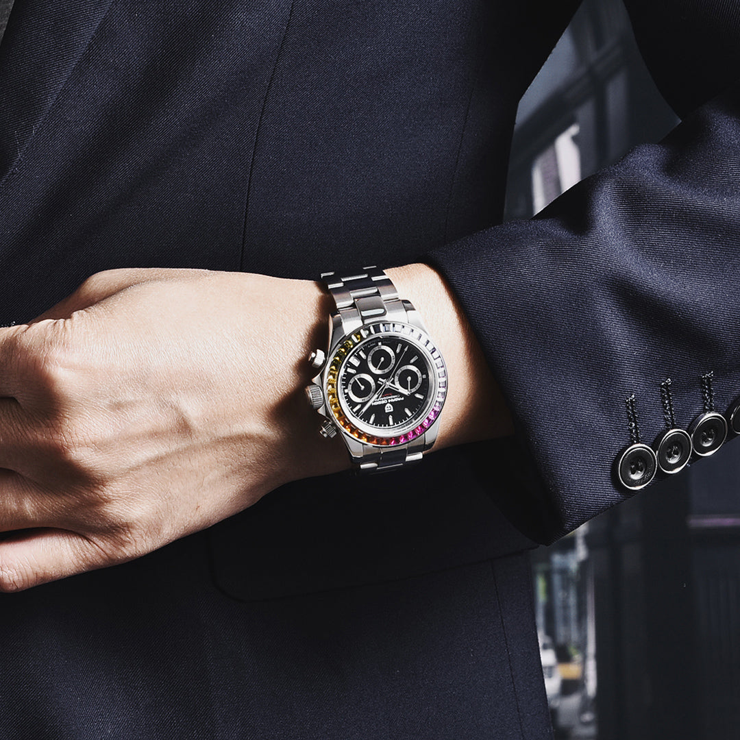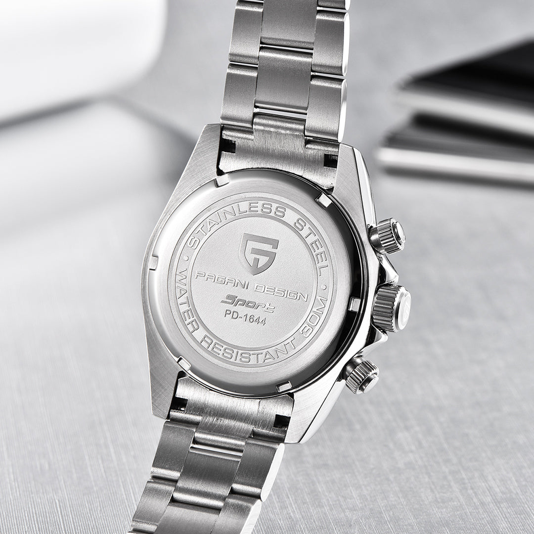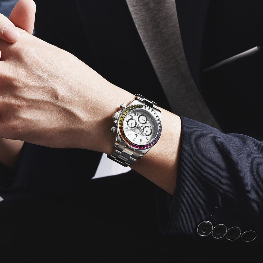 PAGANI DESIGN PD1644 Men's Chronograph Quartz Watches Rainbow Bezel Stainless Steel Sports Wristwatch SEIKO VK63 Movement, Sapphire Dial Glass